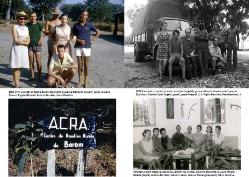 Foto 1: i/le primi/e 6 volontari/e di ACRA in Ciad; Foto 2: i/le volontari/e con Padre Gherardi; Foto 3: il cartello di ACRA a Borom; Foto 4: la prima sede di ACRA in Ciad